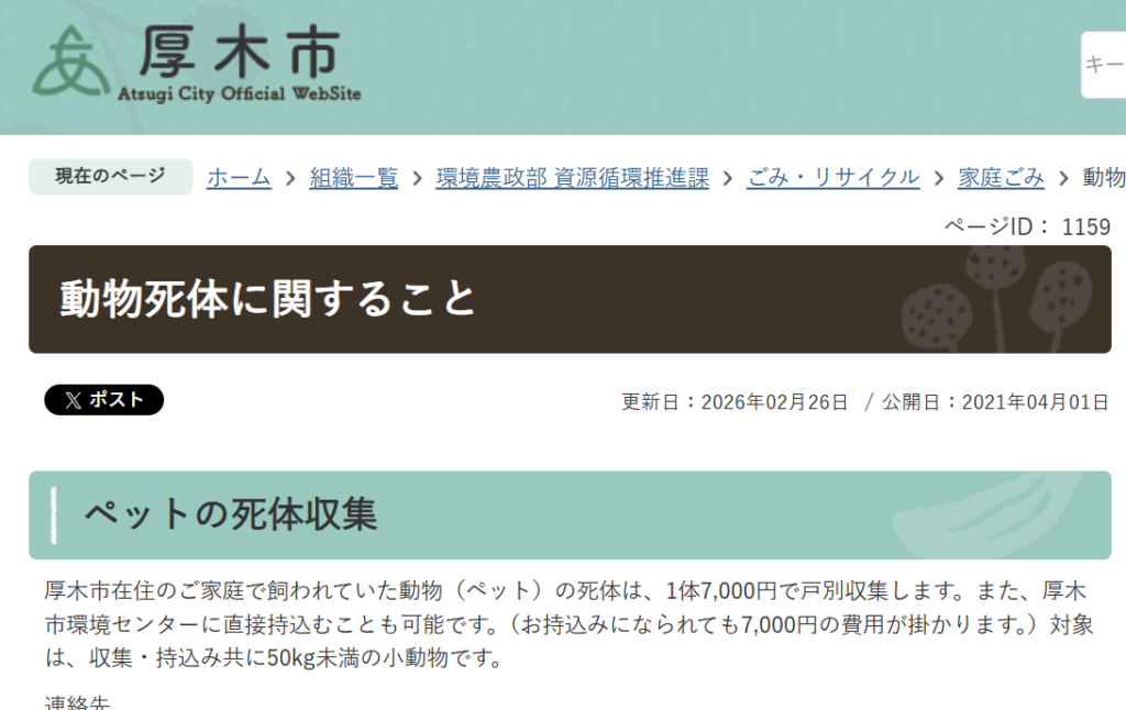 ご家庭で飼われてペットちゃん(厚木市在住であること)は 「1体7,000円で戸別収集」をしてくれくようです。 持ち込みも可のようです→厚木市環境センター ちなみに持込みをしても7,000円は変わらないと記載があります。対象は種類を問わず50kg未満... -