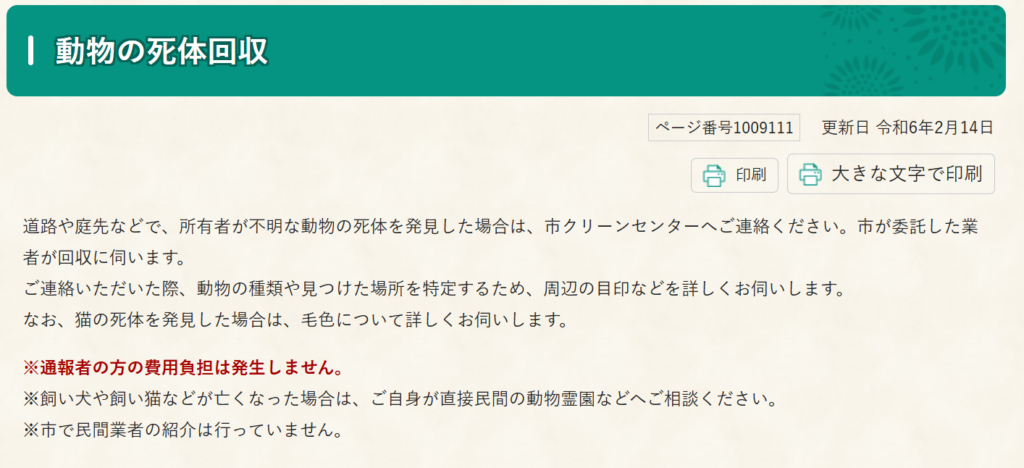 細かい記載がないため 種類の制限はなく対応をしてくれる可能性が高いです。 ページ目次は「動物の死体持ち込み・収集」となっております。 料金は1体1,000円 持ち込み先は 戸吹クリーンセンター・舘クリーンセンターの二つのようです。 収集依頼の場... -